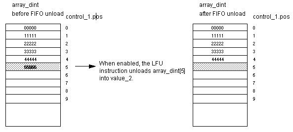 When enabled, the LFU instruction unloads the value at .POS of the LIFO and places that value in the Destination. The instruction unloads one value and replaces it with 0 each time the instruction is enabled, until the LIFO is empty. If the LIFO is empty, the LFU returns 0 to the Destination.
