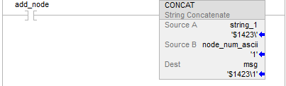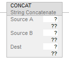 The CONCAT instruction combines the characters in Source A with the characters in Source B and places the result in the Destination.