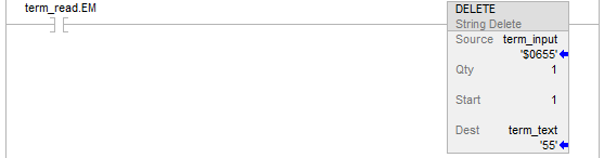 ASCII information from a terminal contains a header character. After the controller reads the data (term_read.EM is on), the DELETE instruction removes the header character. The controller can then use the text of the message or pass it on to another device.
