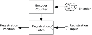 This figure shows how the registration position is latched by the registration input when a registration event occurs. The latching mechanism can be implemented in the controller software (soft registration) or, for greater accuracy, in physical hardware (hard registration).