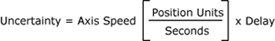 The accuracy of the registration position value, saved as a result of a registration event, is a function of the delay in recognizing the specified transition (typically 1 µsec for hardware registration) and the speed of the axis during this time. The uncertainty in the registration position is the distance traveled by the axis during this interval as shown in this equation:
