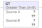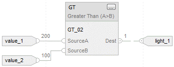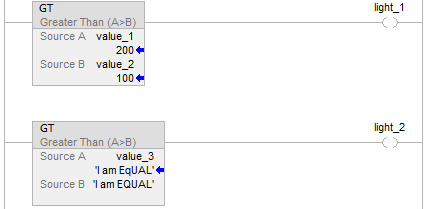 Rung-condition-in is true | Numeric compare: If Source A and Source B are not NANs and Source A is greater than Source B. Set Rung-condition-out to true else Clear Rung-condition-out to false. |