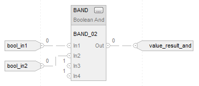 In this example, bool_in1 is copied into BAND_02.In1, bool_in2 is copied into BAND_02.In2, the result of performing AND of all BAND_02 inputs is placed into BAND_02.Out, and BAND_02.Out is then copied into value_result_and.
