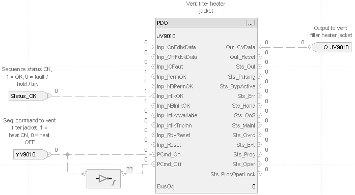 Use the PDO instruction to control a heating jacket on a vent filter. The heating jacket is being used in this case to keep the vent filter dry when there is potential for condensate buildup. The vent filter heater jacket does not provide the feedback on its status. In normal operating conditions, the vent filter heater jacket is being commanded on or off by the control sequence configured in the controller. Always command the vent filter off on interlock associated with the status of the controlling sequence of the heating jacket.