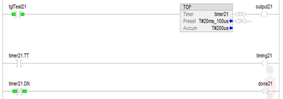 until the TOF instruction is enabled. If tglTest21 is true while timer21 is timing, timing21