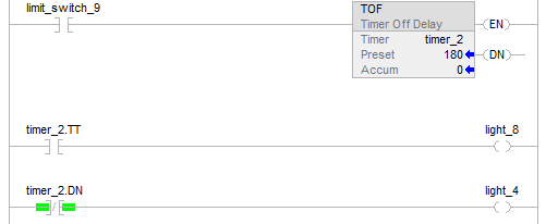When limit_switch_9 is cleared, light_8 is on for 180 milliseconds (timer_2 is timing). When timer_2.acc reaches 180, light_8 goes off and light_4 goes on. Light_4 remains on until the TOF instruction is enabled. If limit_switch_9 is true while timer_2 is timing, light_8 goes off.