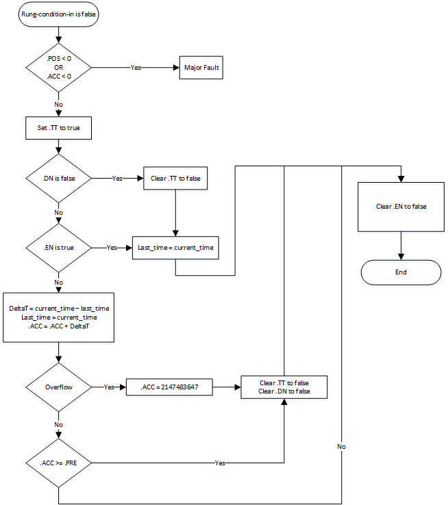 Rung-condition-in is false | Set Rung-condition-out to Rung-condition-in. See TOF Flow Chart (False). |