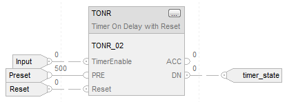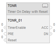 Set the Reset input parameter to reset the instruction. If TimerEnable is set when Reset is true, the TONR instruction begins timing again when Reset is false.