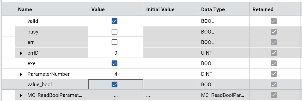 The MC_ReadBoolParameter instruction returns the value of a vendor-specific parameter of type BOOL.