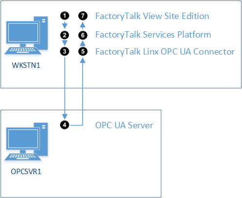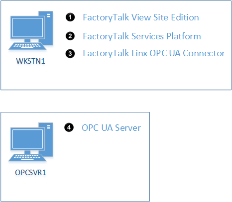![]() | FactoryTalk Linx OPC UA Connector | WKSTN1 | FactoryTalk Linx OPC UA Connector settings configured using .FactoryTalk Linx OPC UA Connector server and endpoint selection settings configured using . |