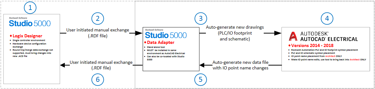 For AutoCAD Electrical, use the Studio 5000 Data Adapter tool to exchange data between the