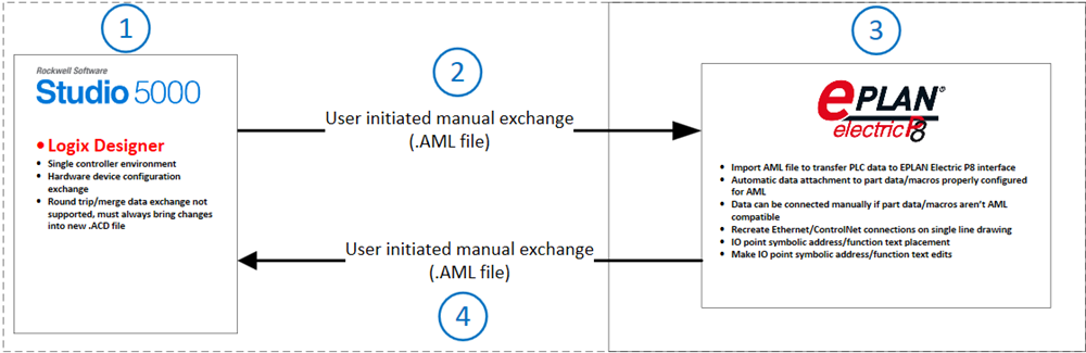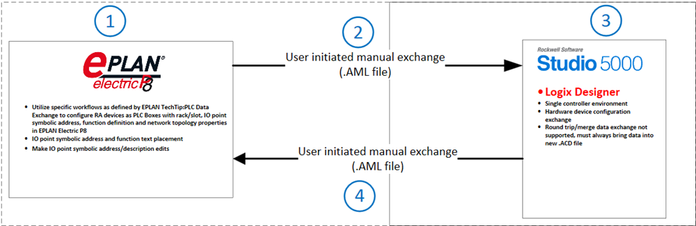 application, versions 32.00 and later, and EPLAN Electric P8, versions 2.9 and later.This workflow shows the process for data exchange from supported