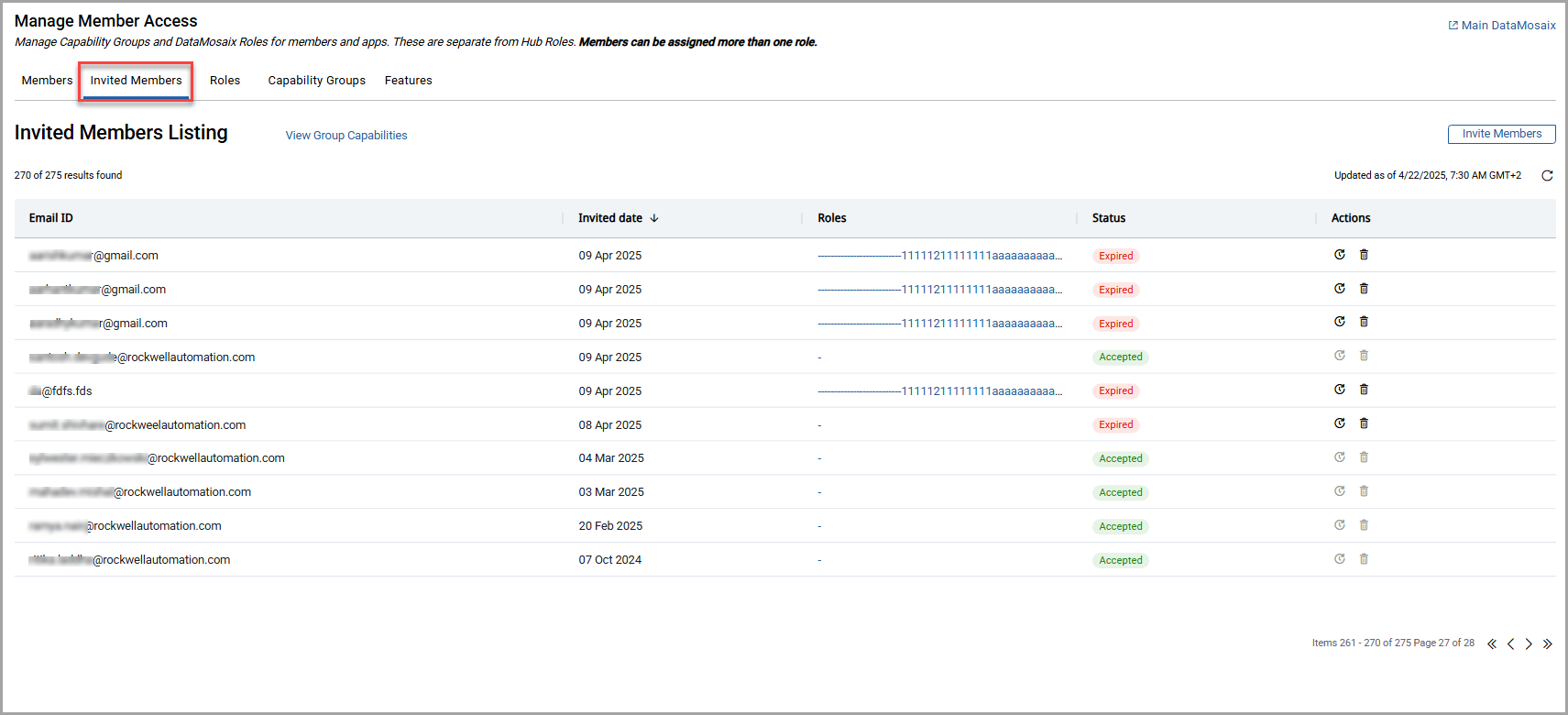 page allows you to see which emails were sent invitations, the dates they were sent and the roles that were assigned. You can see the status of each invitation.The possible statuses are: