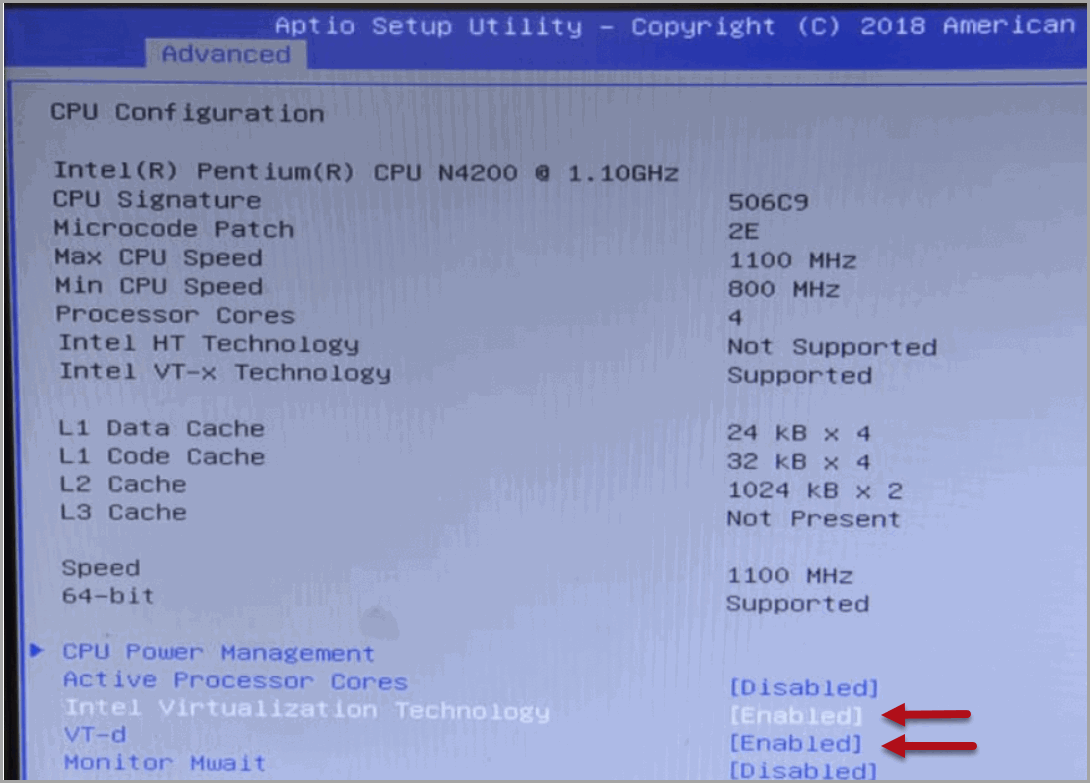 - Go to the Advanced tab and ensure that Intel Virtualization Technology and VT-d are enabled.NOTE:Ensure that you disable the secure boot, if enabled on the edge node.Advanced Tab