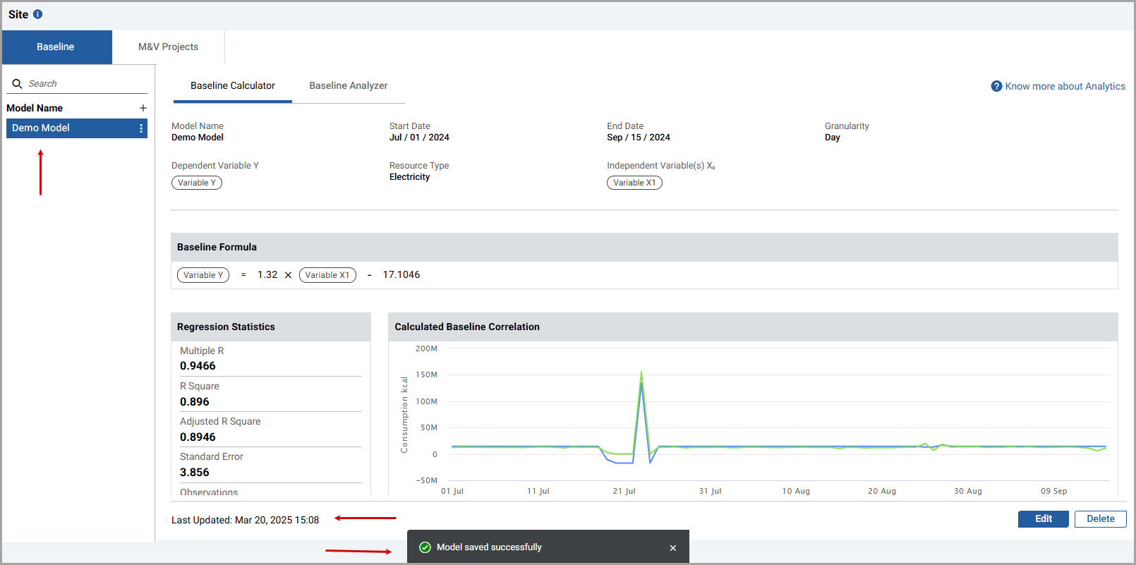 NOTE:The equation for a straight line is y = mx + c or, in case of energy consumption driven by output: Energy = (Slope x Output) + InterceptIn this equation, the intercept represents the energy consumption as output trends toward zero (the baseload) and the slope represents the incremental energy consumed per unit of output.A high baseload can indicate significant potential for energy savings by investigating on why so much energy is consumed even when production trends towards zero. - ClickSave. The "Model saved successfully" message is displayed, and the model is added to the list.The last updated time stamp is displayed at the bottom.Moved Saved Successfully