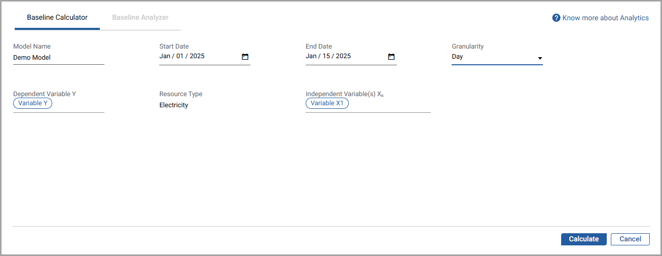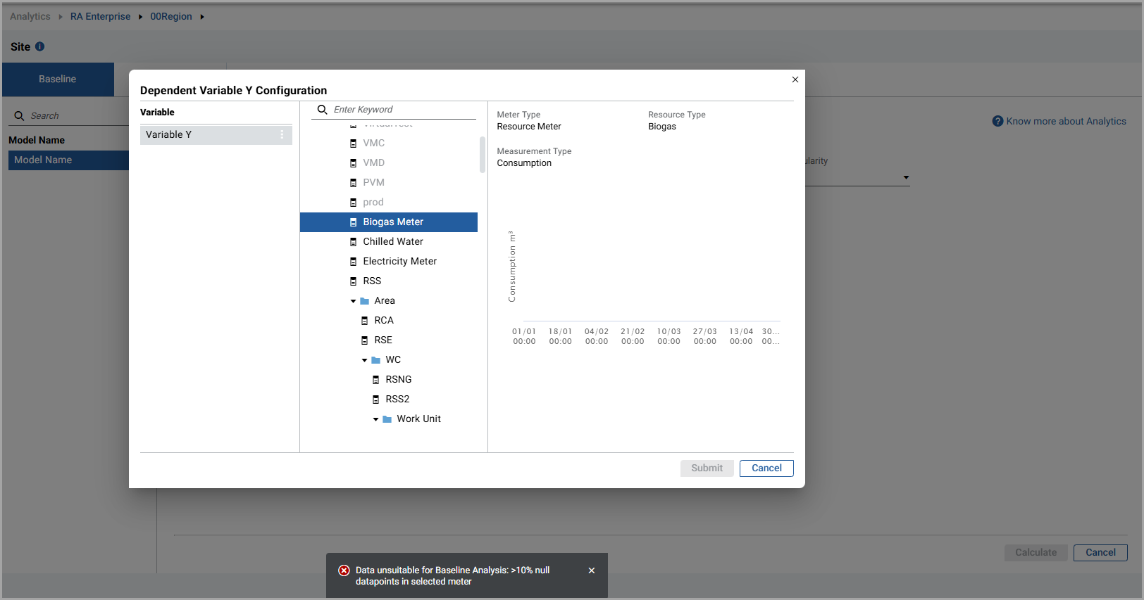 NOTE:The application displays the message "Data unsuitable for Baseline Analysis: > 10% null datapoints in selected meter(s)" message for X variables when multiple X meters are selected and the combination of datapoints in these meters exceeds 10% null datapoints.Data Unsuitable for Baseline Analysis