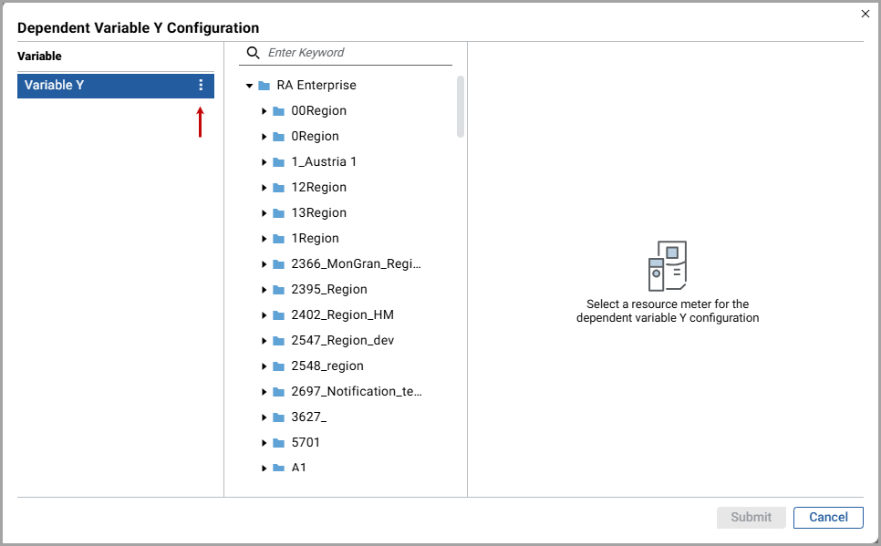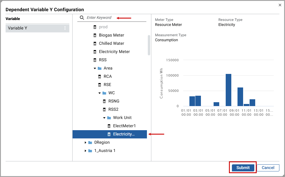 - Select a resource meter from the hierarchy for the dependent variable Y configuration and clickSubmit.TIP:The user can use the search option to navigate to the resource meter easily.NOTE:Users can select meters that are already present in the FactoryTalk Energy Manager energy model asDependent Variablewhich will internally select the timeseries tagged to these meters.