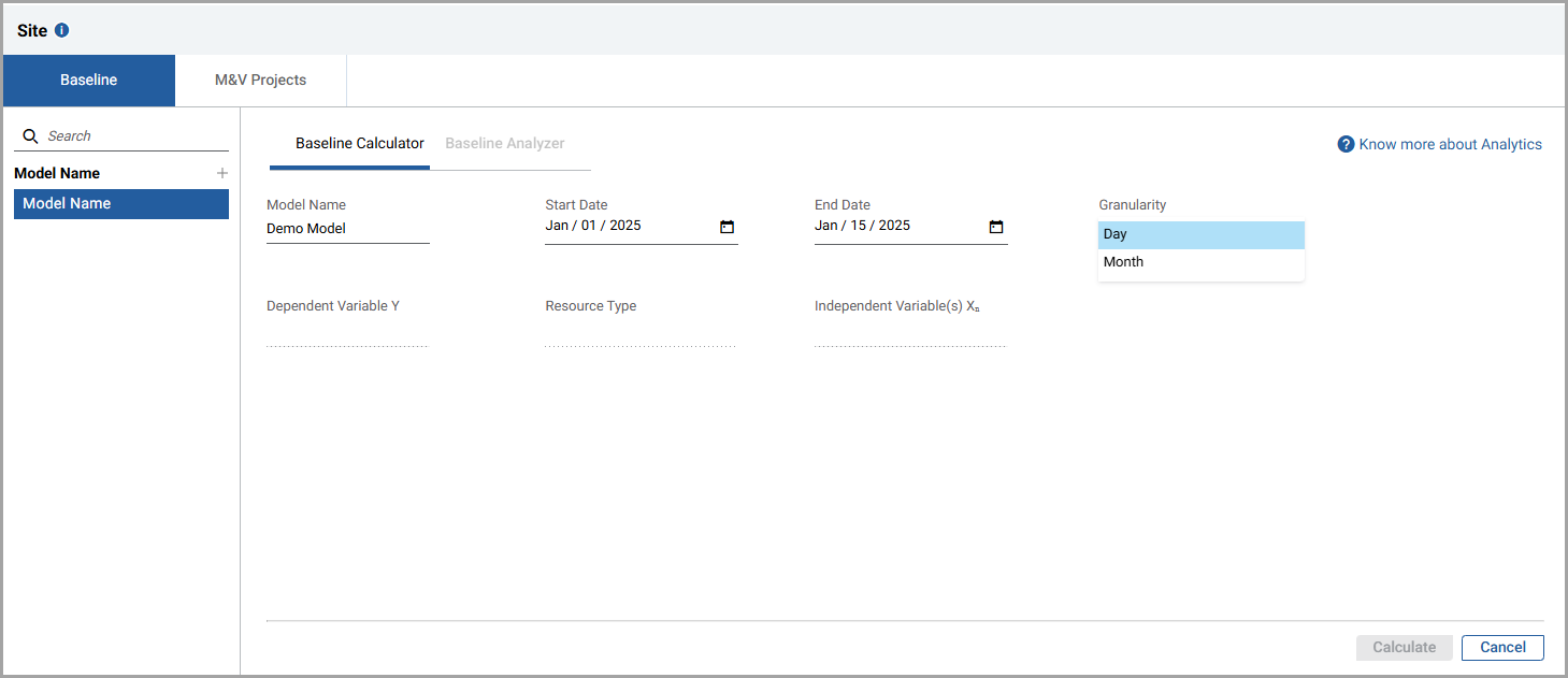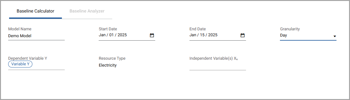 - Select theBaseline Start DateandBaseline End Dateusing the date picker.NOTE:Users select the start and end date of the baseline calculation period. The application does not allow the selected date range after Today (the present day). This date range decides how much data will be used for the baseline model training and formula creation. The meters selected in the previous step may have data from previous and future times than the selected date range, but the selection of the range narrows down the data to be used for calculations.