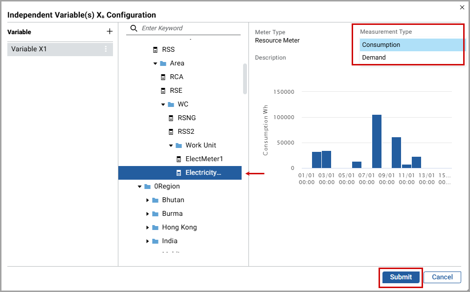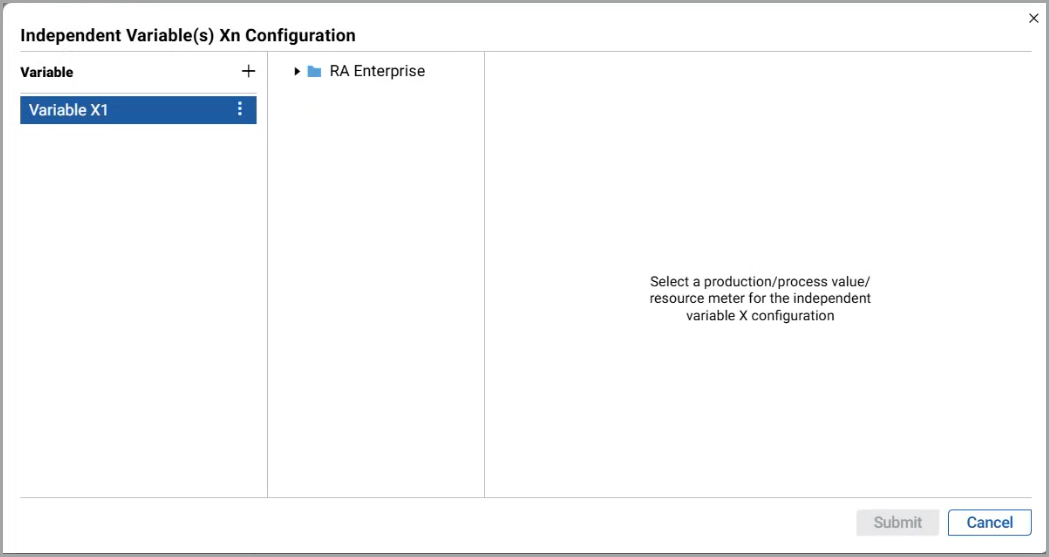 - Select a Production/Process Value/Resource meter for the independent variable X configuration, select the Measurement Type from the dropdown, and clickSubmit.NOTE:Users can select meters that are already present in the FactoryTalk Energy Manager energy model asIndependent VariablesandDependent Variablewhich will internally select the timeseries tagged to these meters.