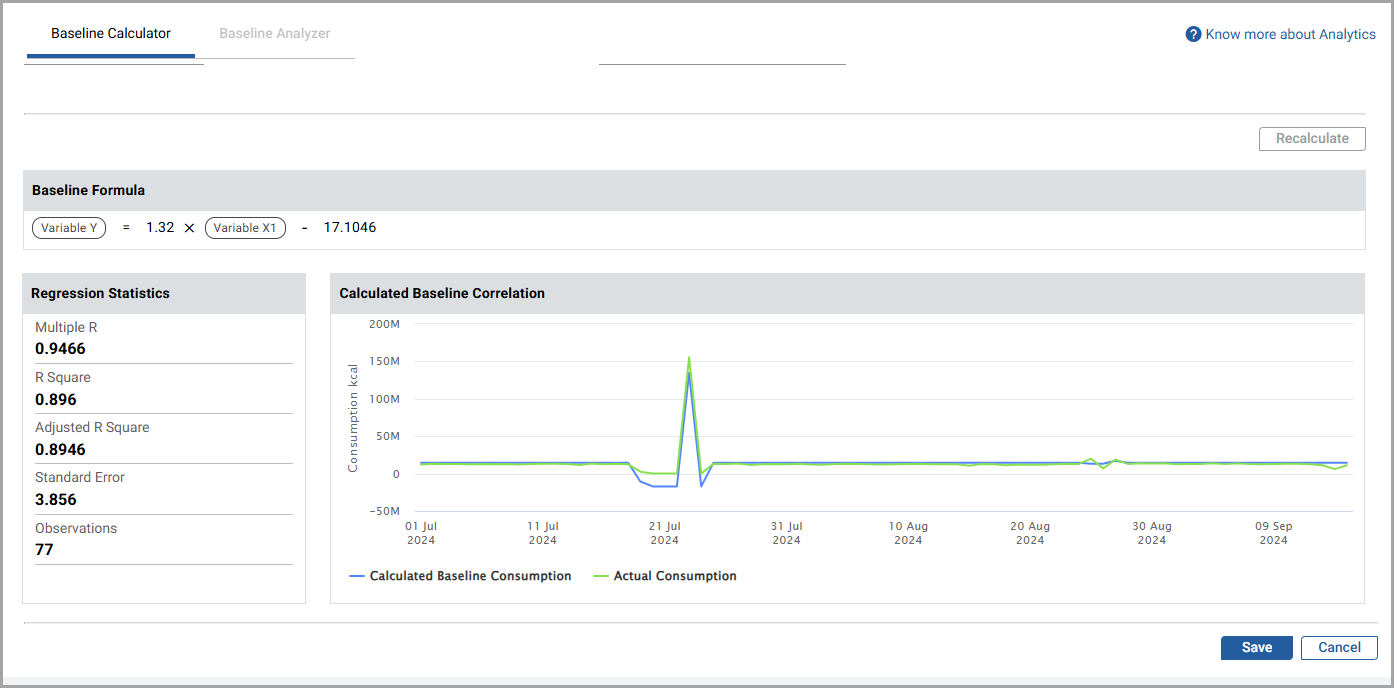 - ClickRecalculateto perform the baseline calculations with the new changes.NOTE:On recalculating the baseline analysis, the regression analysis does not change unless the model changes are saved.