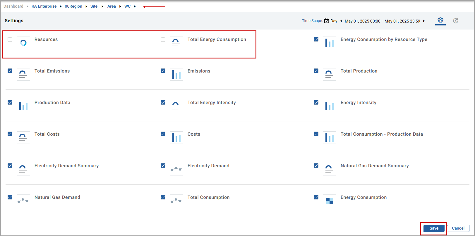 - Select/clear the required chart check box to show/hide to the dashboard, and clickSave.Enterprise Dashboard Chart Settings