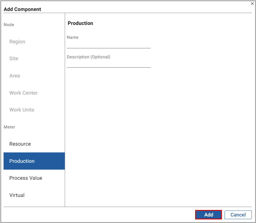 TheAdd Componentdialog box is displayed. - UnderMeterfrom the left pane, selectProductionand provide the following details: