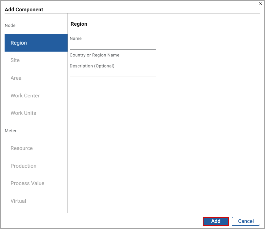 - ClickAdd.The "<Region Name> added under the <Enterprise Name> successfully" message is displayed.