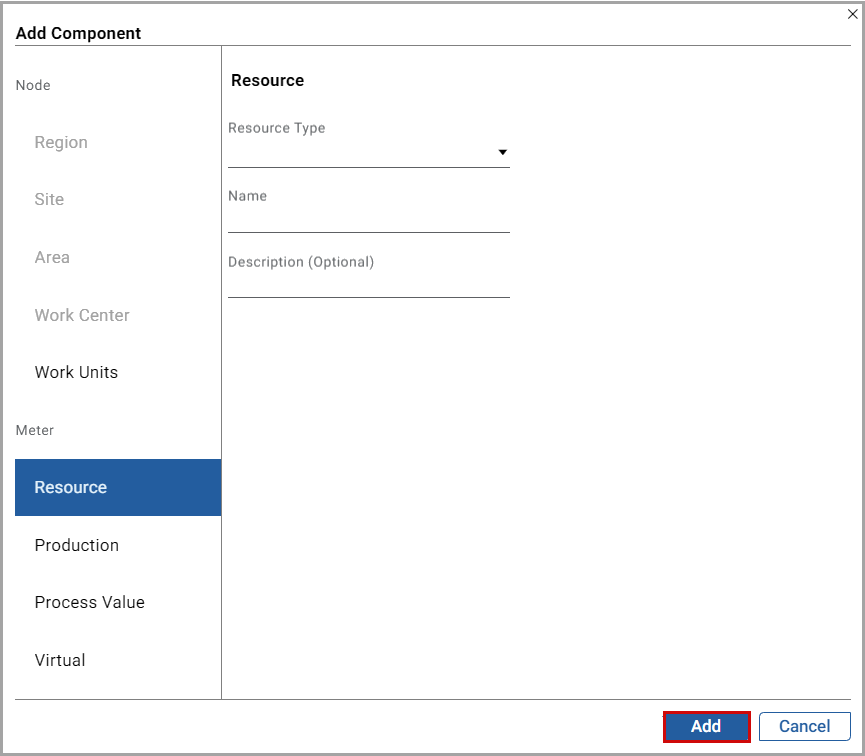 - ClickAdd.The "<Resource Meter Name> added under <Site/Area/Work Center/Work Unit Name> successfully" message is displayed.