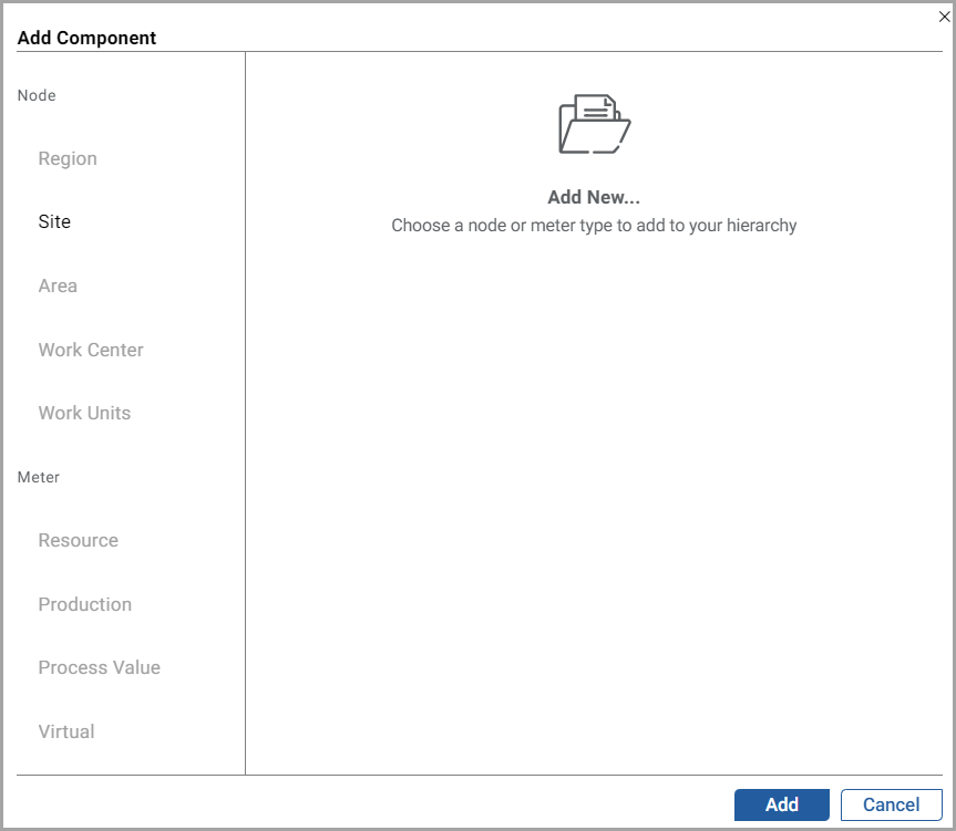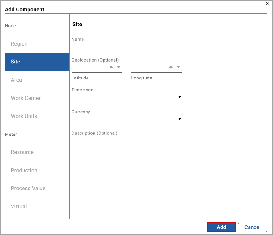 NOTE:In the Site component, the user can configure base details (geolocation, currency, time zone) and configure the Configure Resource Types, Configure Emissions Factors, Configure Measurands, Configure Parameters, and Configure Rate Schedules.Add Component -Site Dialog