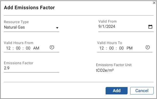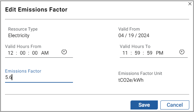 ] icon. - On theEdit Emissions Factordialog box, edit the fields, and clickSave.Edit Emissions Factor