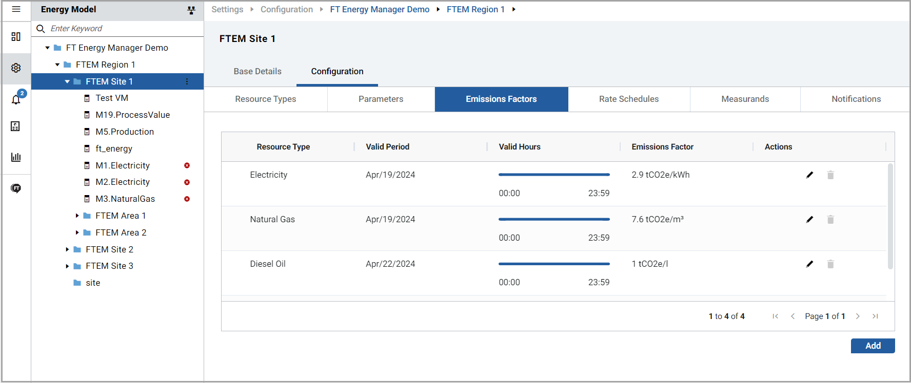 This feature enables users to add, edit, and delete emission factors, allowing them to set specific parameters to calculate and manage emissions produced by various resource types over defined periods.