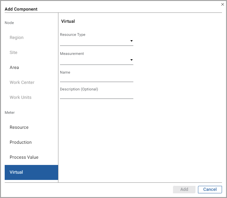 TheAdd Componentdialog box is displayed. - UnderMeterfrom the left pane, select theVirtualmeter and provide the following details: