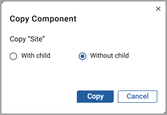 Copy.NOTE:If the user copies the parent component directly, they need to selectwith childorwithout childradio button in theCopy Componentdialog and clickCopy.Copy Component
