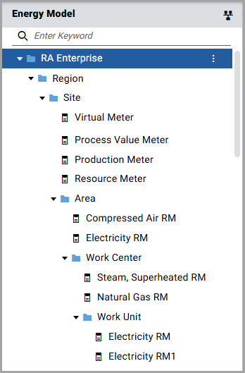The hierarchy tree displays the Region, Site, Area, Work Center, Work Unit, and various meters configured under the Enterprise-level for the Energy Model. Click the [
