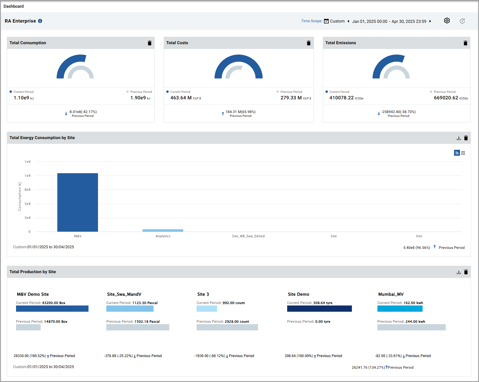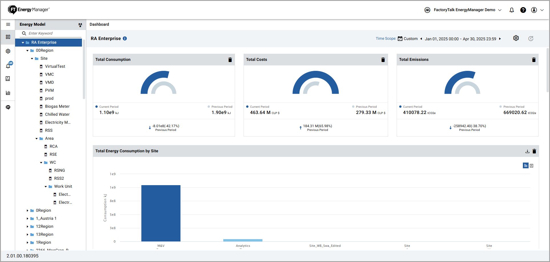 The dashboard provides insights into energy consumption, energy intensity, costs, and emissions through widgets and charts. These insights are available for each node within the organization, including Enterprise, Region, Site, Area, Work Center, Work Unit, and various meters.
