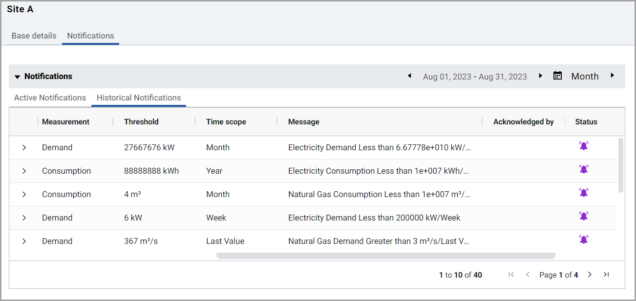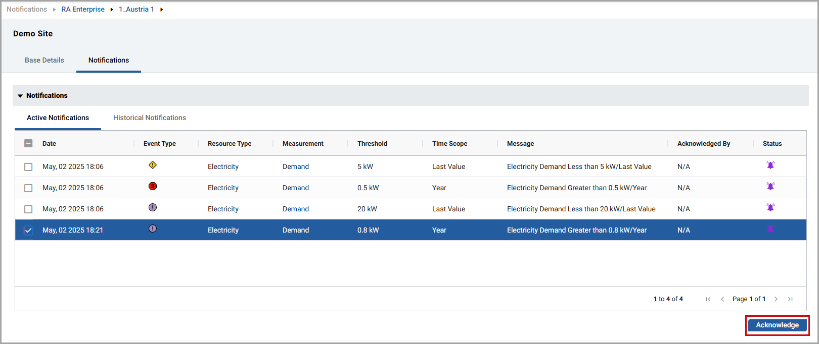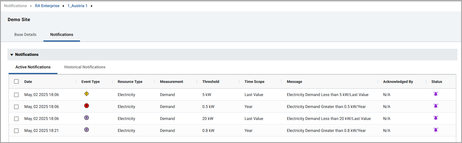 Notifications are triggered when configured conditions are met. Initially, notifications are added to the active notification. As a user, you can acknowledge the notification. When the status reaches normal acknowledged, it is moved automatically to the historical notification. The options available in the notification list are similar for all levels of the hierarchy list. The notification list is not applicable for Enterprise, Region, and Meters.