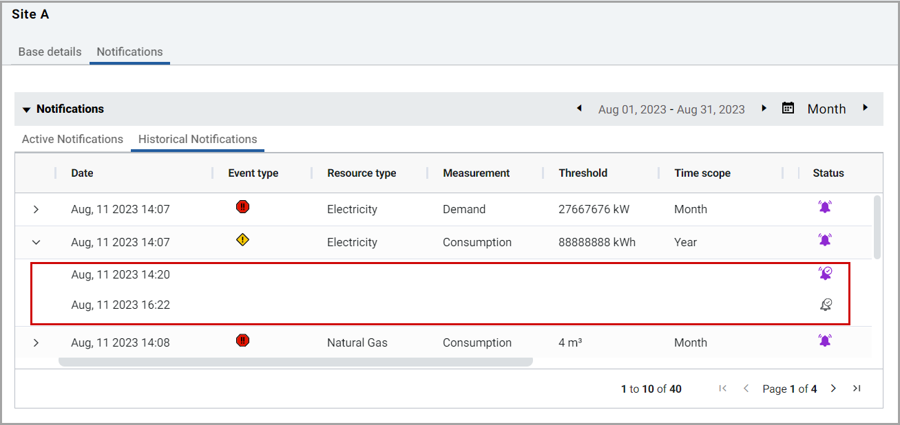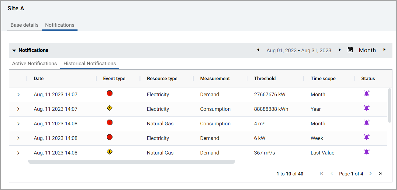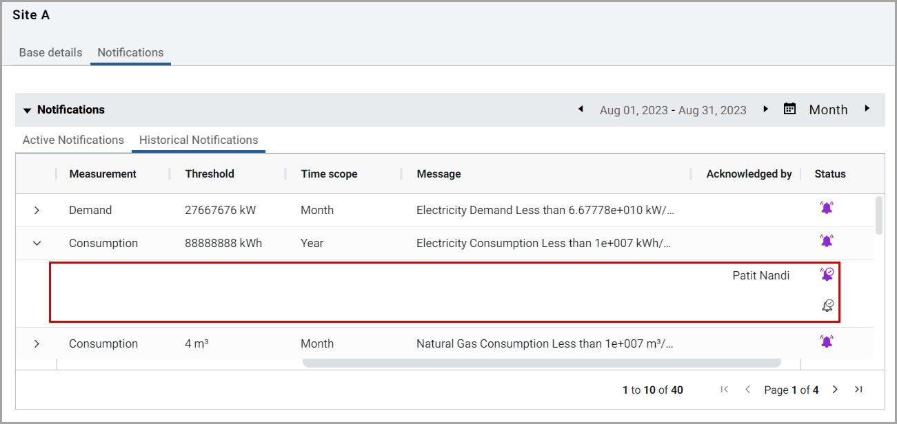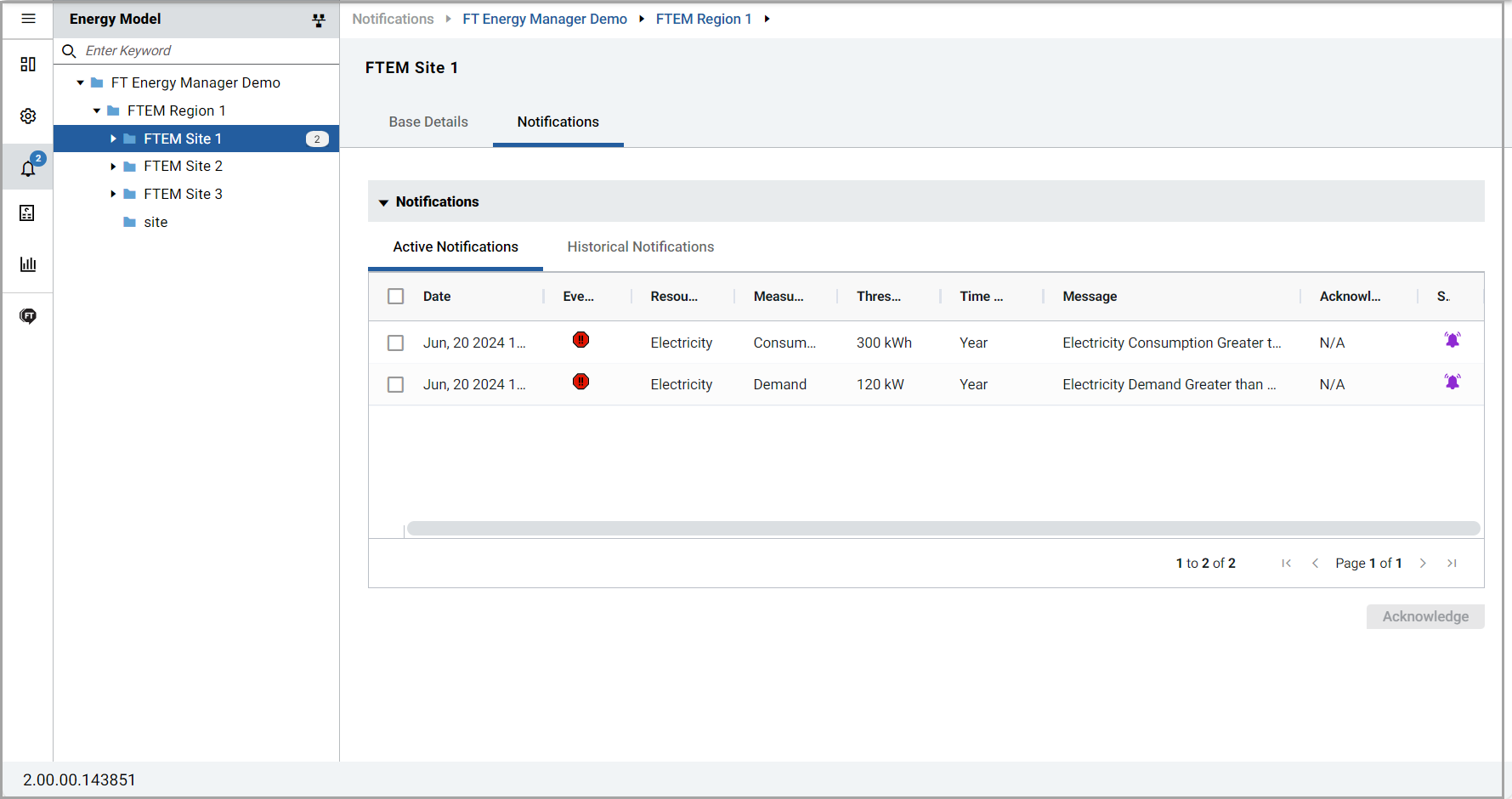 Notifications are triggered when configured conditions are met. Initially, notifications are added to the active notification. As a user, you can acknowledge the notification. When the status reaches normal acknowledged, it is moved automatically to the historical notification. The options available in the notification list are similar for all levels of the hierarchy list. The notification list is not applicable for Enterprise, Region, and Meters.
