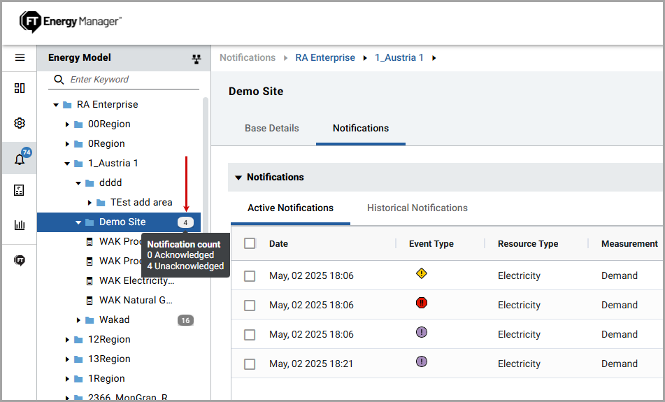 - Notification count will be displayed in the Energy Model at site level (in both Dashboard and Notifications section) and the user can hover to view the details of Acknowledged vs Unacknowledged notifications.Notification Count