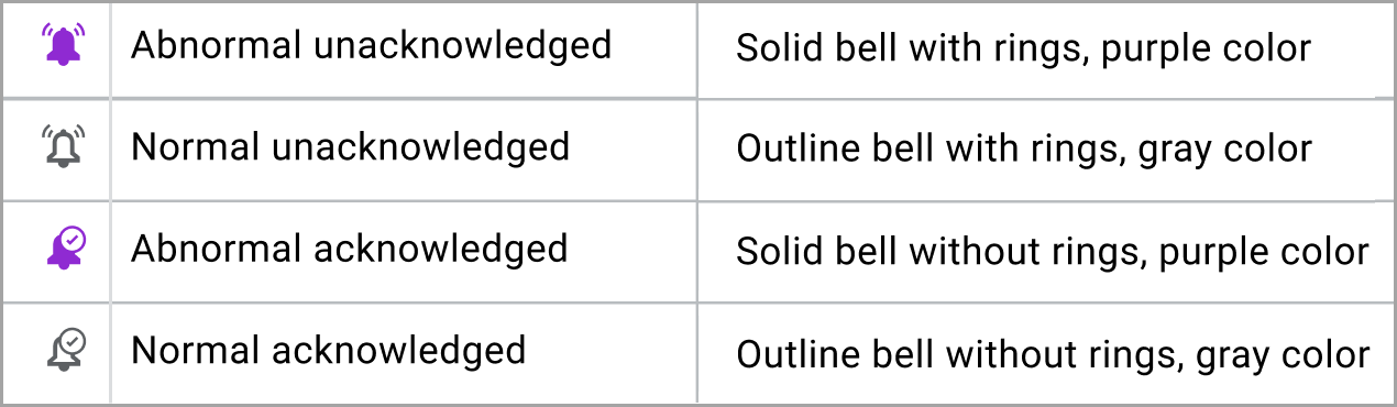Notification Condition | Acknowledgement Status | Display on Active Notifications tab | Display on History Notifications tab |