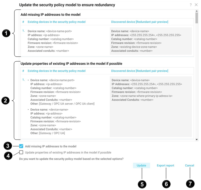 dialog to update the security policy model for Redundant Chassis Pairs.Dialog example