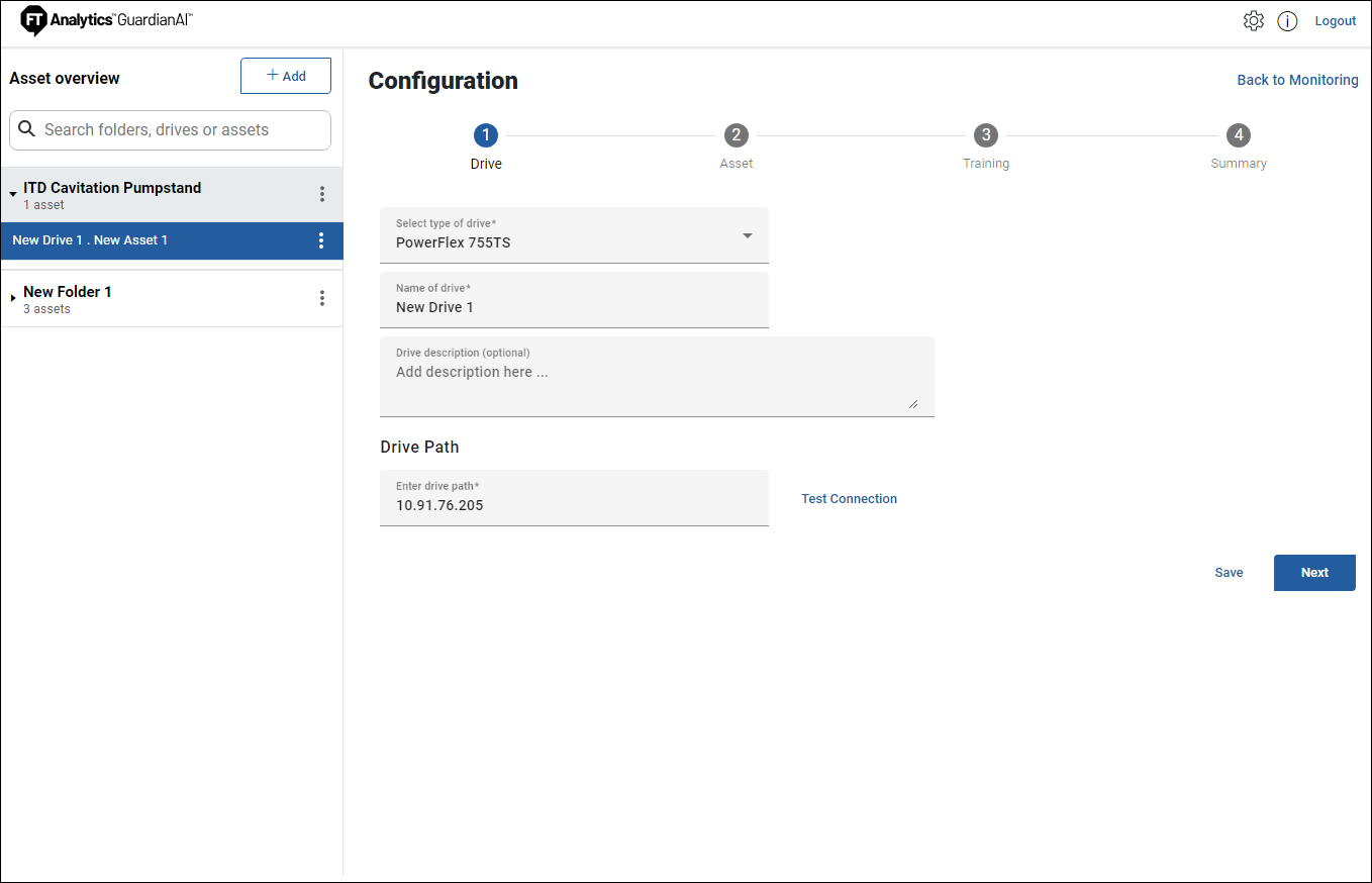 Test the connection to the drive to ensure the drive is connected and FactoryTalk Analytics GuardianAI can successfully establish and validate the connection.