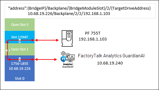 The more likely scenario is the PC that hosts FactoryTalk Analytics GuardianAI is on the same network layer as the controller. In this case, the user needs to input the full CIP path mapping from the controller to the drive.