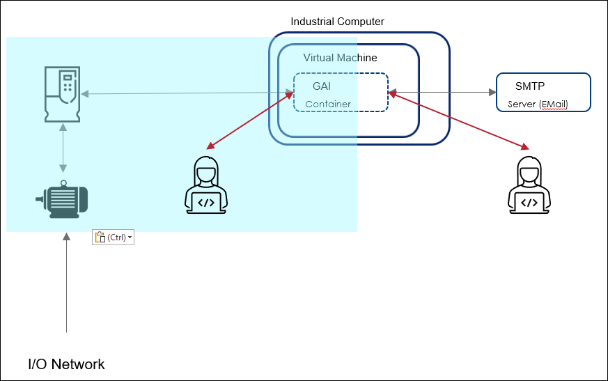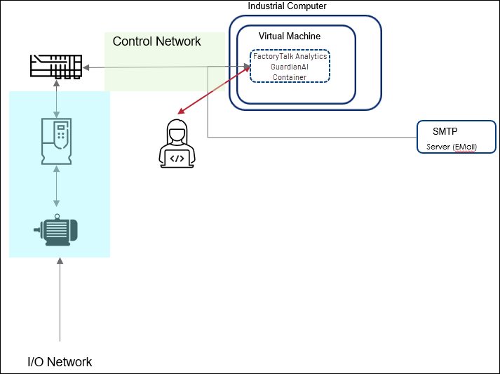The following illustration depicts the PC that hosts FactoryTalk Analytics GuardianAI existing on the control network and the variable frequency drive (VFD) on a subnet.