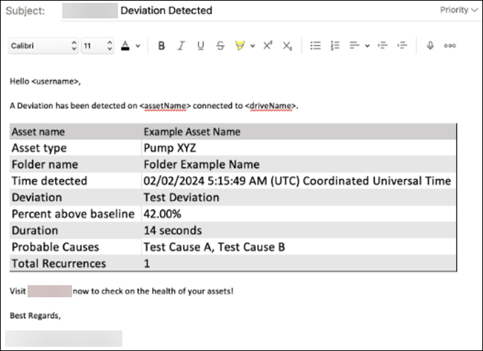 , the notification contains the information, as shown in the following image.Example of Deviation Notification Email
