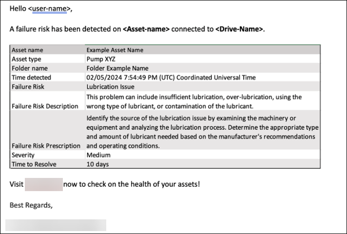 , the notification contains the information, as shown in the following image.Example of Failure Risk Notification Email