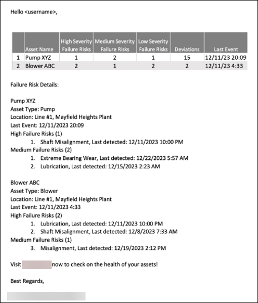 The summary notification provides a high-level table regarding all unlabeled deviations and unresolved failure risks for all assets monitored by FactoryTalk Analytics GuardianAI. The table rows will show the asset names, with one row dedicated to each asset. The table columns include the count of unresolved Failure Risks ranked by severity, along with the count of unlabeled existing deviations with the last column showing the time stamp of the last detected event. Below the table is the enumeration of each asset with additional details regarding the detected failure risks and deviations