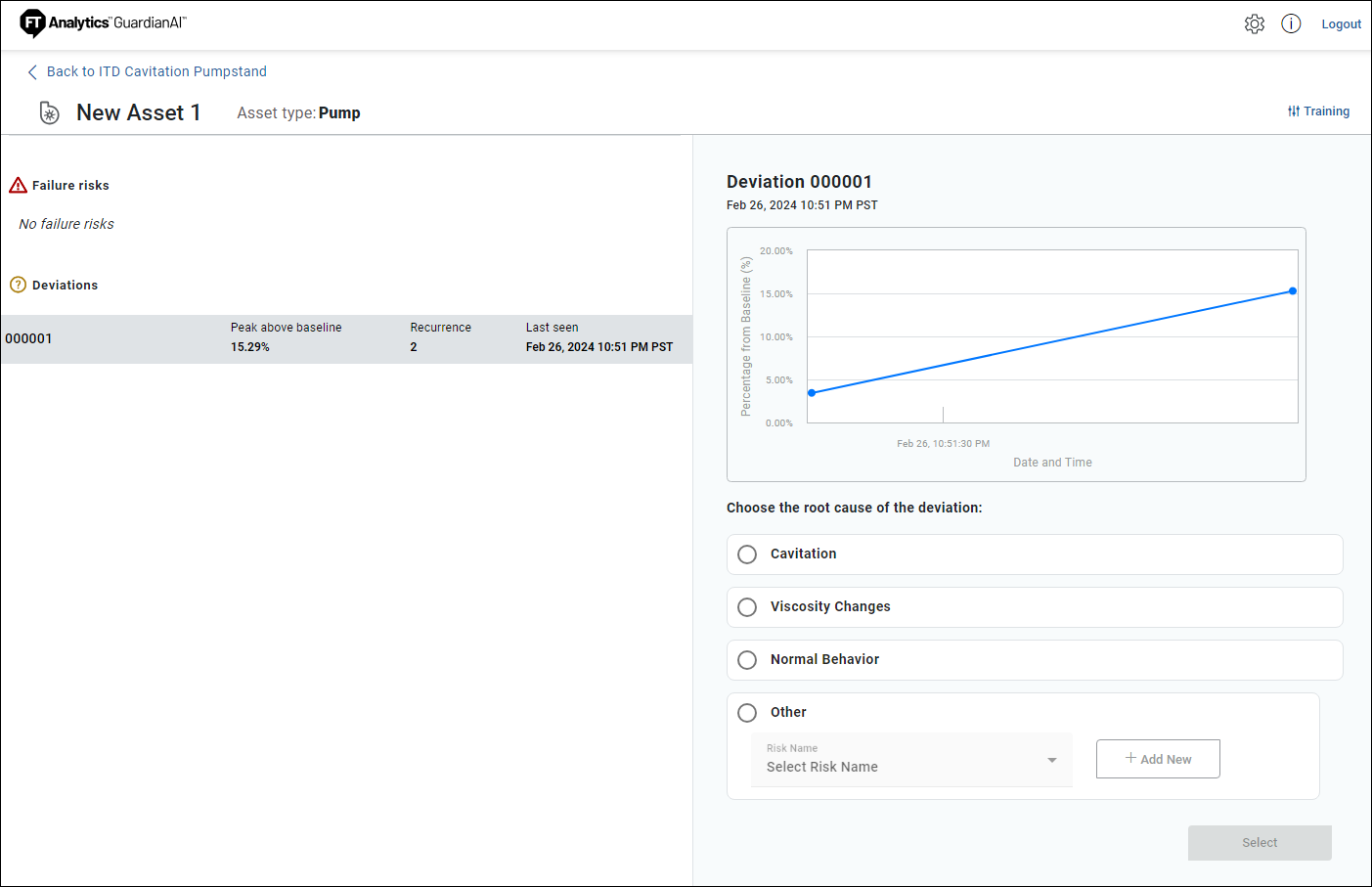 The single asset page provides detailed insight regarding deviations and failure risks encountered while monitoring. All new anomalies will first be displayed as a deviation until a user labels the item. Once labeled, a deviation becomes a failure risk.