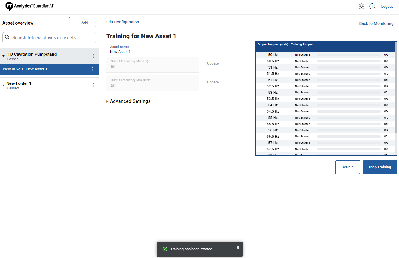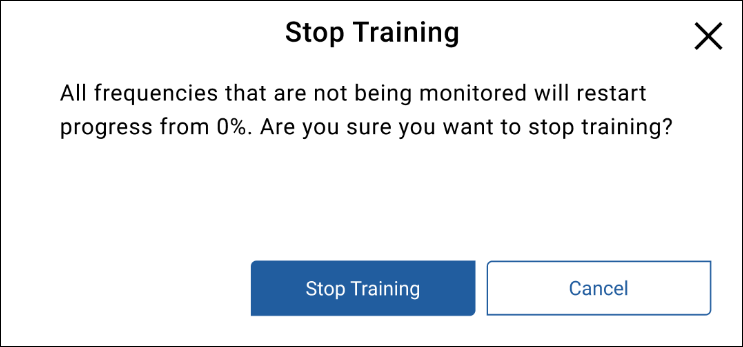 Stopping training will also stop monitoring the asset. Once the user stops training, any frequency bucket in progress will be reset back to 0%. Frequencies that were already fully trained are preserved and will resume monitoring once the user starts training again.