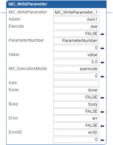The MC_WriteParameter parameter modifies the value of a vendor-specific parameter of type REAL.