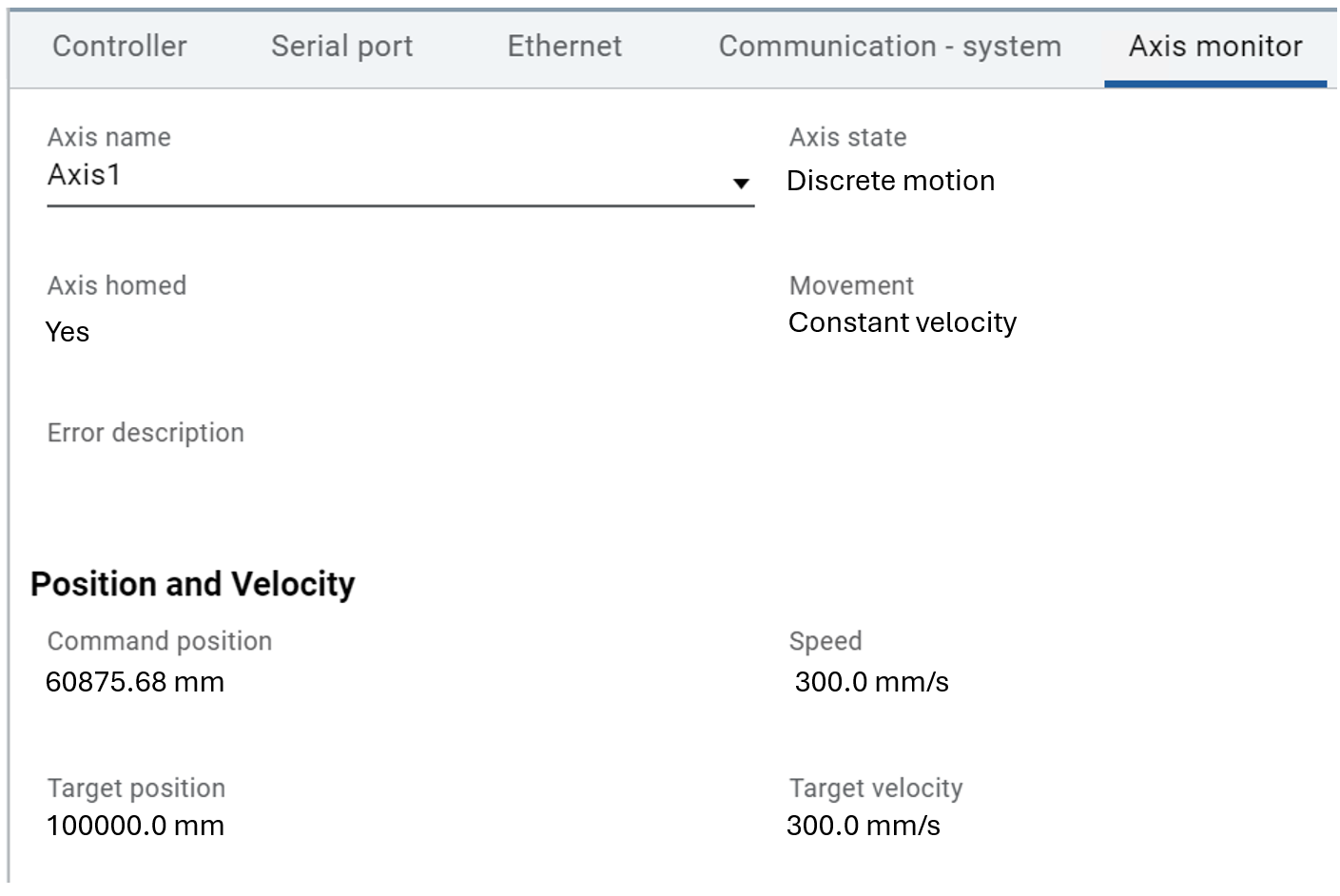 CommandAborted | Output | BOOL | TRUE: Command was overridden by another command, or Error Stop. |